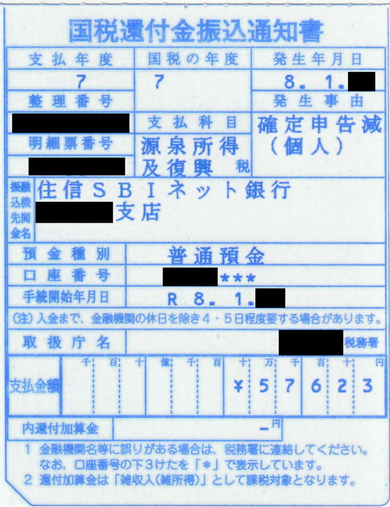 令和7年分の確定申告により、税務署から配当所得等の還付がありました。昨年は配当金と年金等の所得で、所得税率は23%であり、約5万7千円の還付となりました。
